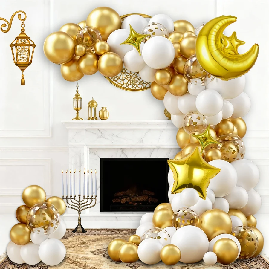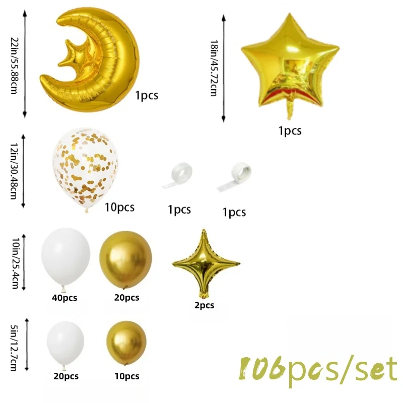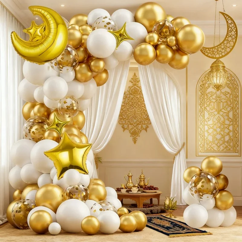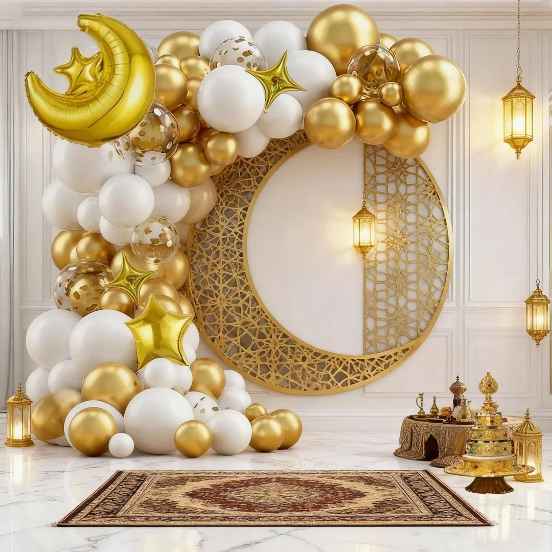Maak van Eid al-Fitr of Eid al-Adha een onvergetelijk feest met deze complete Eid ballonnenset van 106 stuks. Ideaal voor het decoreren van de woonkamer, feestzaal of kinderruimte tijdens Eid.