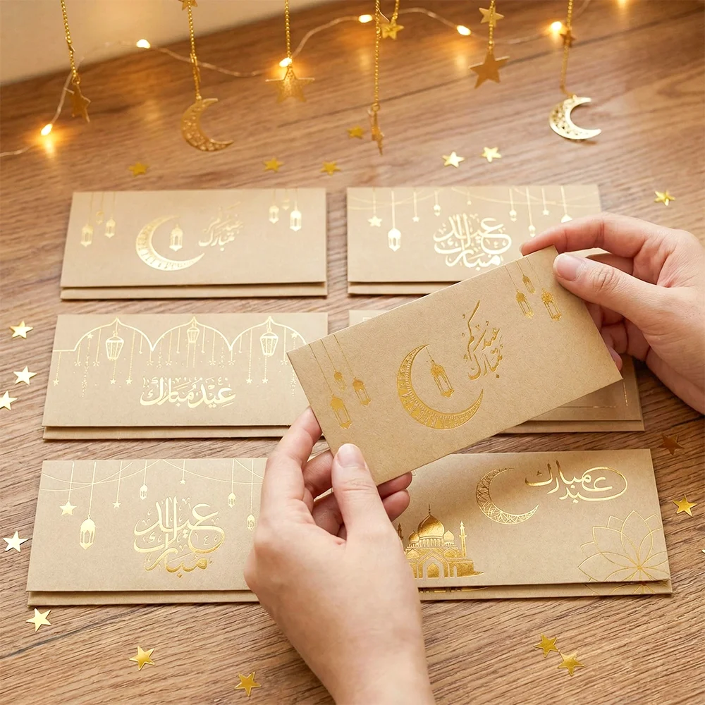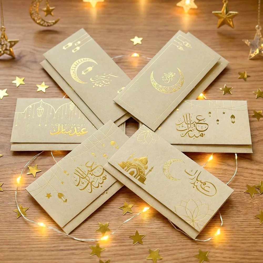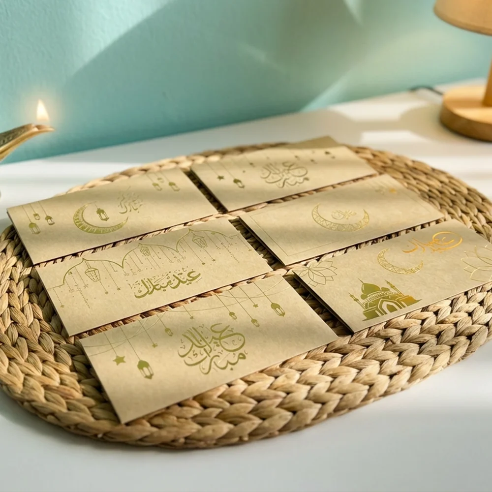 Deze stijlvolle Eid-enveloppen zijn perfect om geld of een kaart op een elegante manier cadeau te geven. De enveloppen zijn afgewerkt met Arabische sierletters in goud, wat zorgt voor een luxe en feestelijke uitstraling. Ideaal voor Eid. Een eenvoudige manier om je cadeau extra waarde en betekenis te geven.