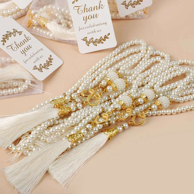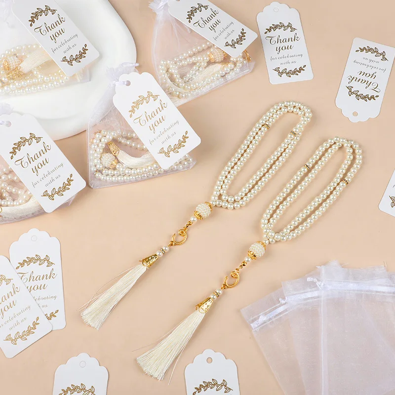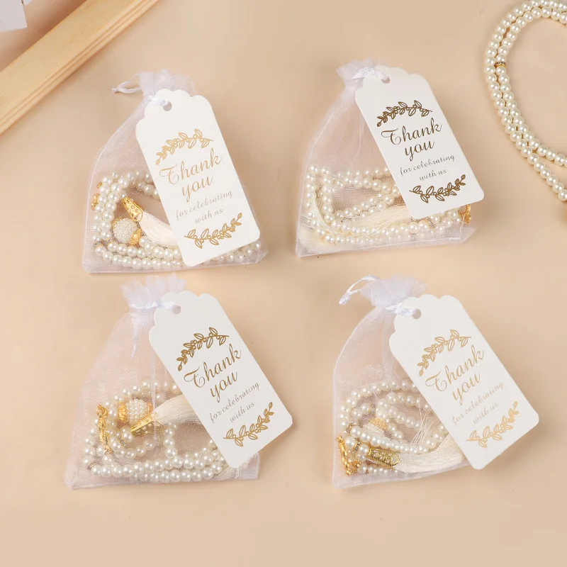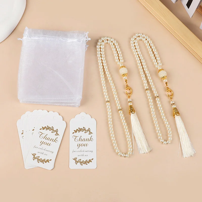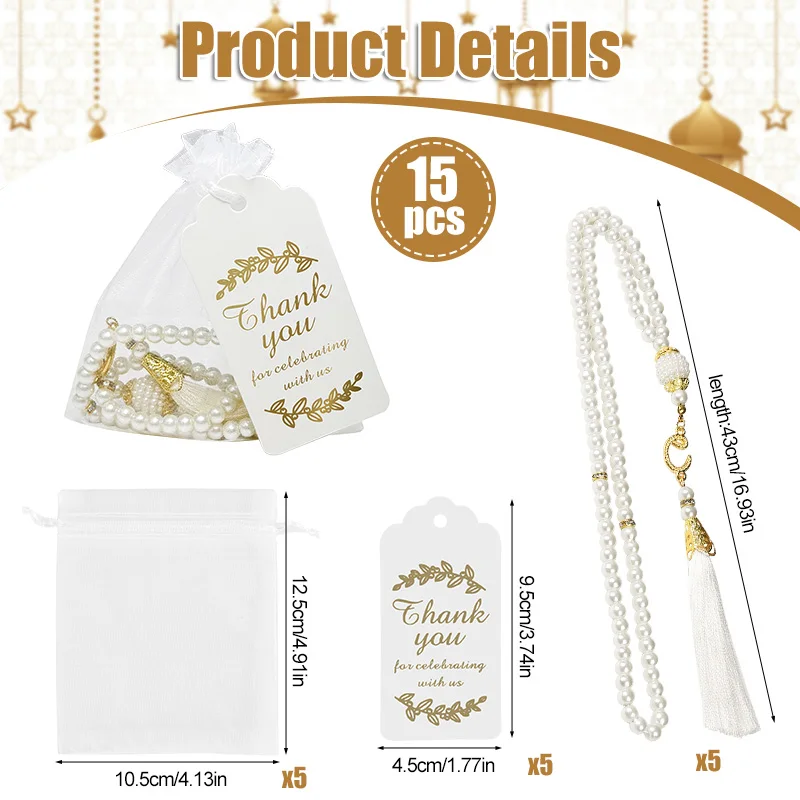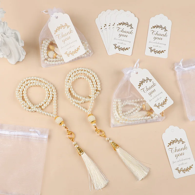 15Pcs Glass Pearl Muslim Prayer Beads Bracelet with Thank You Card Organza Bags Eid Mubarak Ramadan Gift Islamic Home Decoration