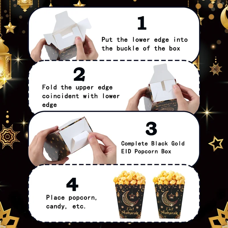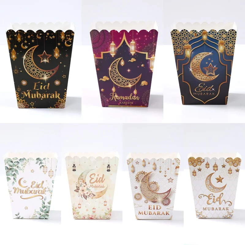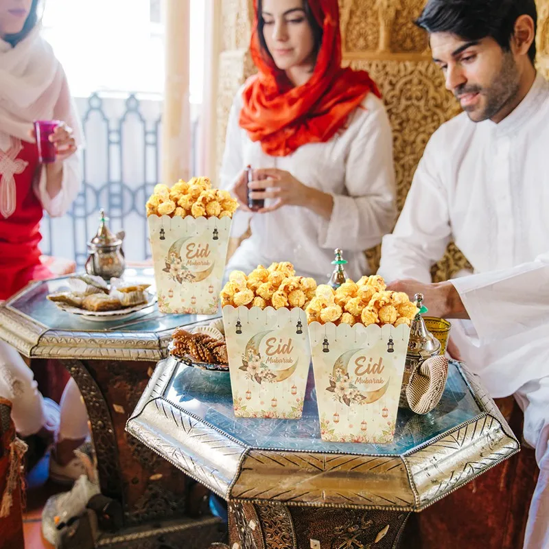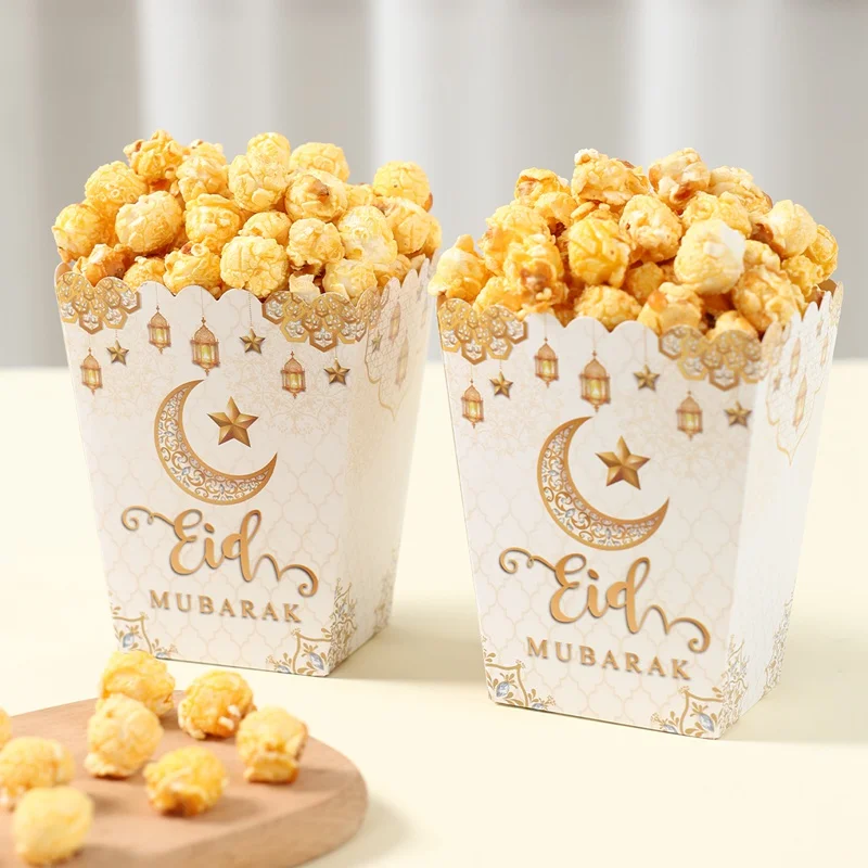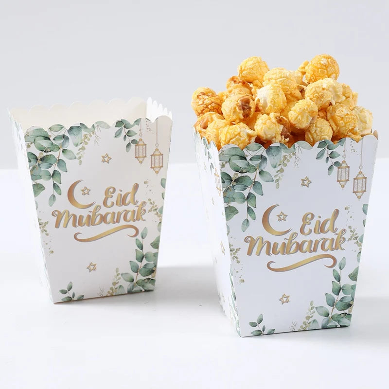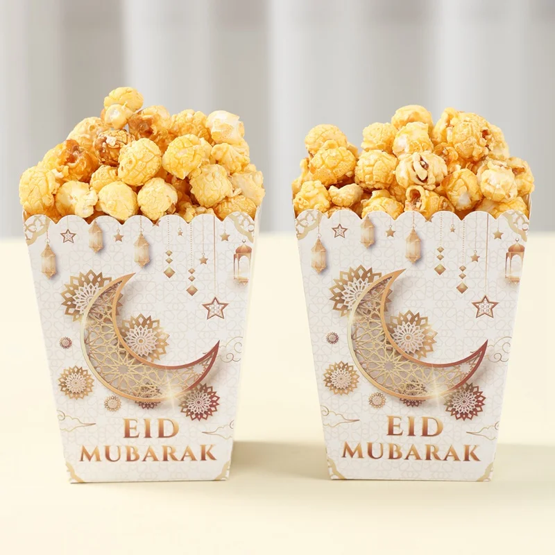 Deze Eid Mubarak popcorn boxjes zijn perfect voor het serveren van popcorn, snoep of kleine snacks tijdens Eid. Ideaal voor thuis, feestjes of bijeenkomsten met familie en gasten. Dankzij het feestelijke Eid-design zorgen ze direct voor sfeer en maken ze elke traktatie extra leuk om uit te delen.